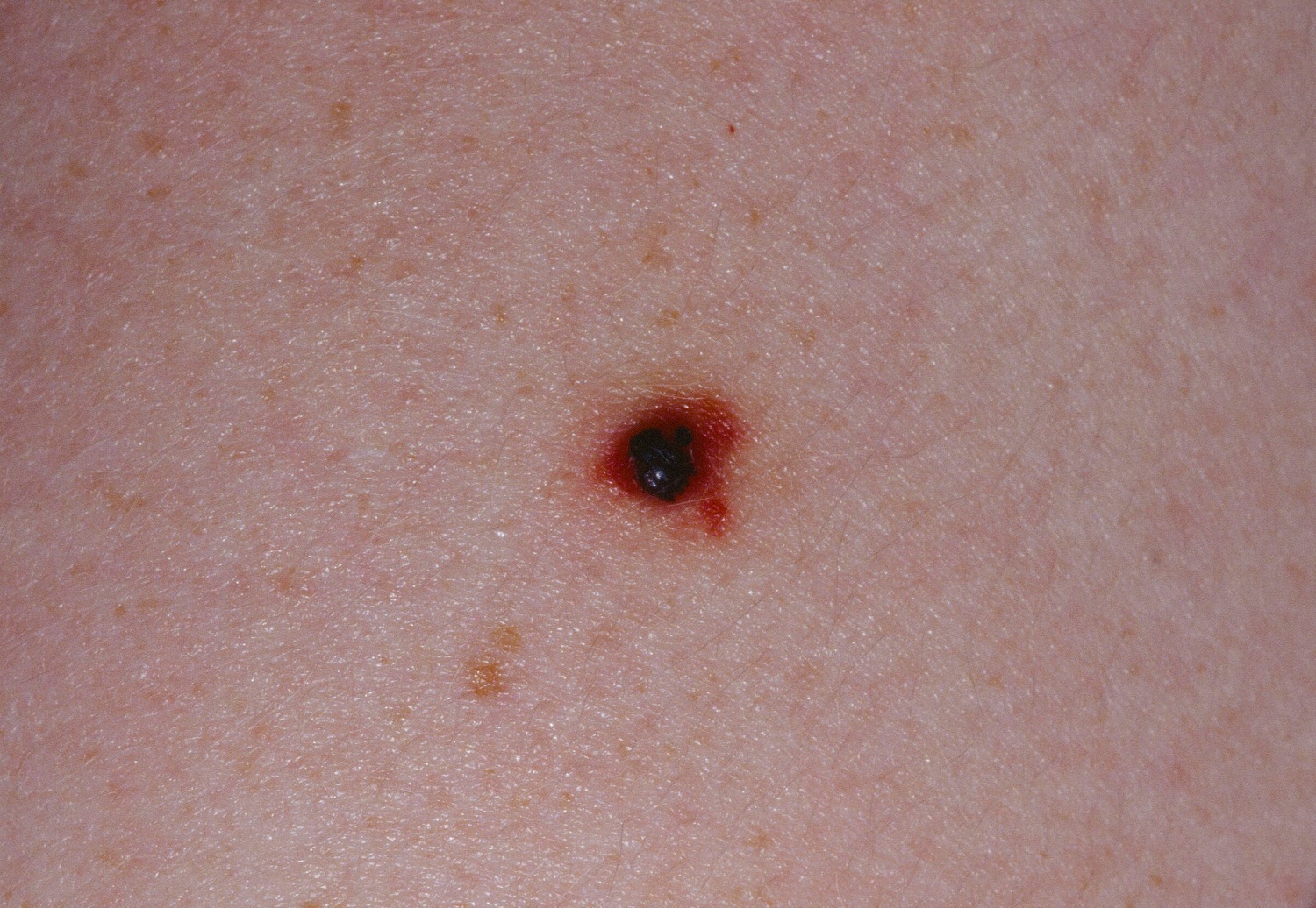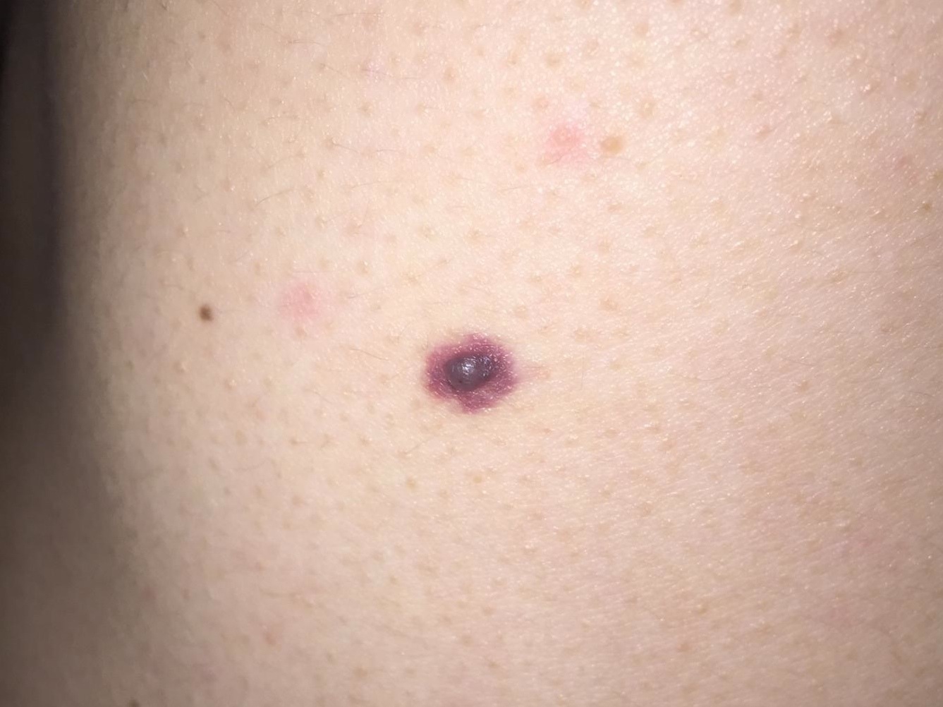 Occasionally an angioma may thrombos, giving the central papule a darker hue and creating a red "bruised" border.