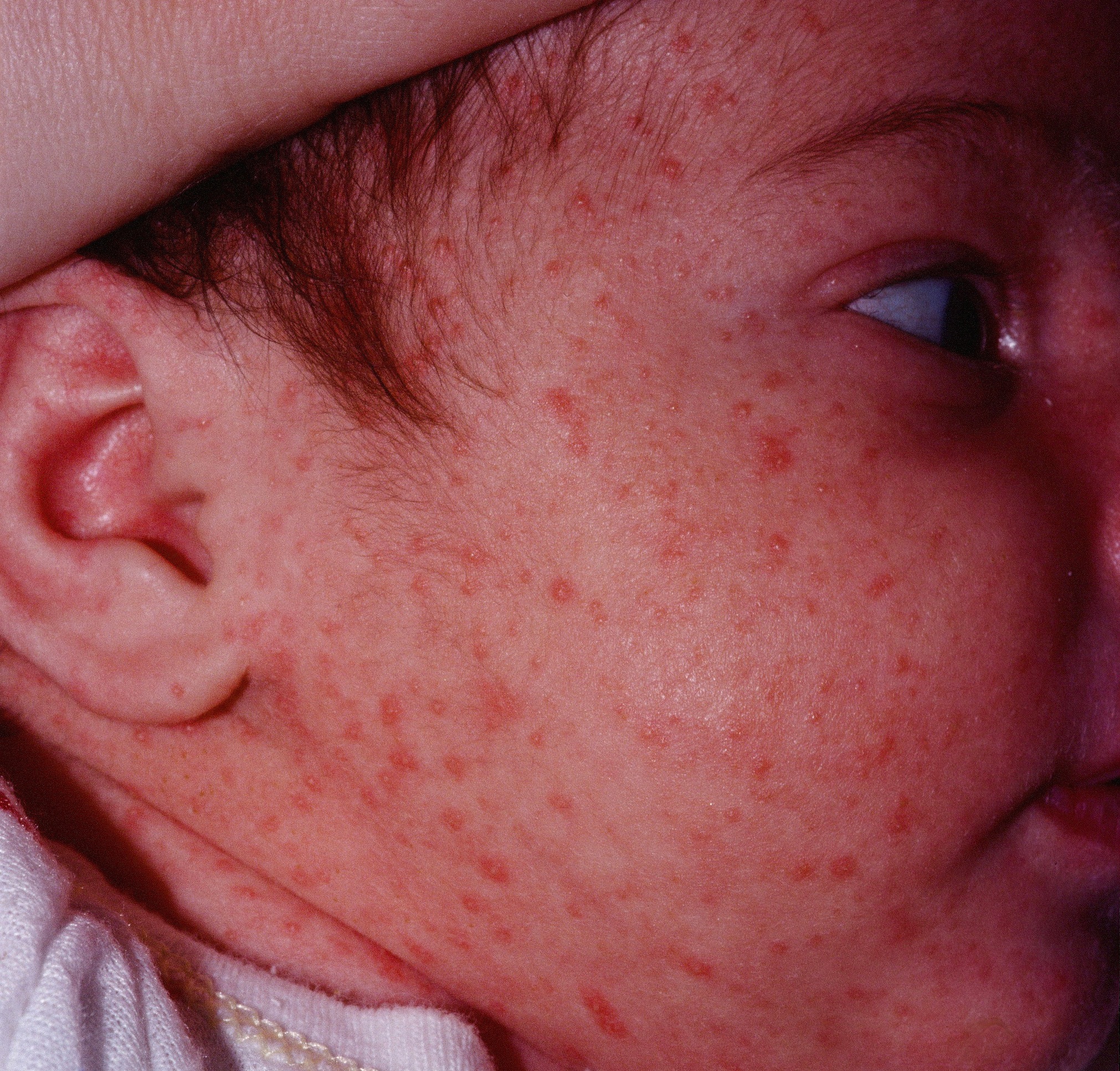 Typically, the newborn develops papulopustular lesions on the face, scalp and neck.